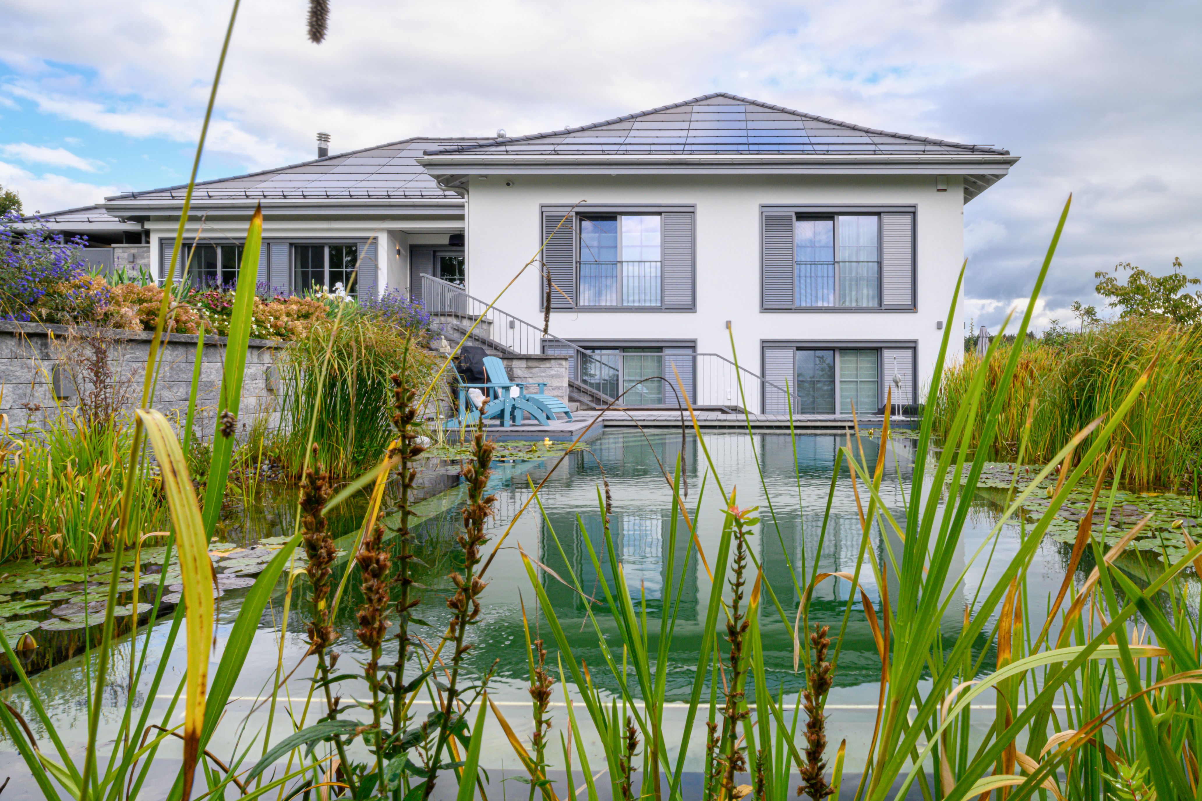 Der neu gestaltete Garten tritt mit der Verwendung von einheimischen Bäumen, Feld- und Wildgehölzen und Trockenmauern als grüne Oase in Erscheinung und lädt zusätzlich mit dem neu realisierten Schwimmteich zum gemütlichen Verweilen ein.
